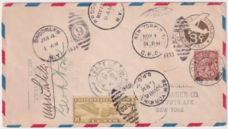 US 1933 (Nov 1) Pond-Sabelli Attempted Non-stop Transatlantic Flight to Rome, Crash in Ireland with C17 and GB definitive. 1998 Irish Crash Airmail Catalogue # 34.05.15.3 variety. Cancelled in NY Nov 1, 1933 then Brooklyn Jan 4, 1934, Brooklyn May 13, 1934 and Ireland May 15, London Jun 7, 1934 and NY Jun 16.Signed by Cesare Sabelli and George Pond, the pilots. To read the story of this flight, click the link to see Pages from the Irish Crash Airmail : Irish Crash Airmails