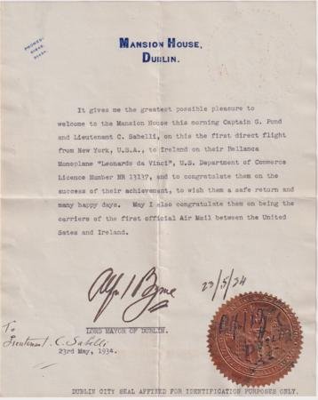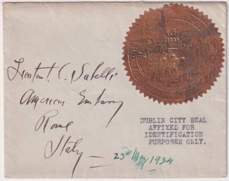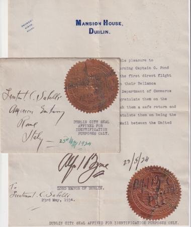 US 1934 Pond-Sabelli Attempted Non-stop Transatlantic Flight to Rome, Crash in Ireland . 1998 Irish Crash Airmail Catalogue # 34.05.15.6 variety. Envelope addressed to Sabelli, c/o American Embassy in Rome. This was previously unknown. The accompanying letter attests to the First Official Air Mail between the U.S. and Ireland (only other known one is damaged) Both letter and envelope are affixed with the Golden City Seal of Dublin and signed by the Lord Mayor of Dublin. To read the story of this flight, click the link to see Pages from the Irish Crash Airmail : Irish Crash Airmails