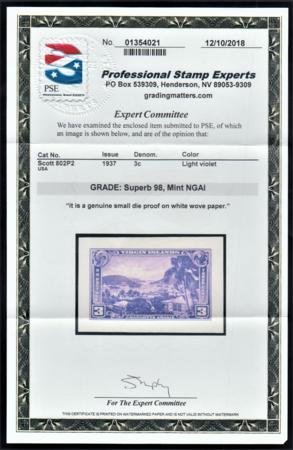 • US 802P2 Superb Unused Small Die Proof on White Wove - PSE 98 Cert
