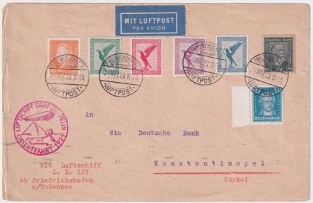 Germany 1929 (Mar 24) Orient Flight cover with four airs and three extra. Attractive cover sent to Turkey. Backstamped at Er Ramle, Palestine. A few 1/8” tears at left could easily be trimmed. Also a difficult to see tear on right side. S.23 I Aa €175
