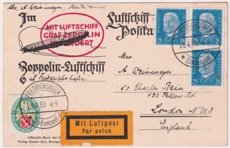 Germany 1930 (Apr 26) Zeppelin Flight to England on VF PPC. Colorful franking, 5pf block of four on reverse, not postmarked. S.55A