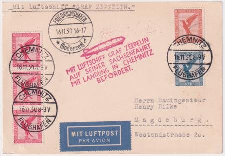 Germany 1930 (Nov 16) Zeppelin Flight Chemnitz to Friedrichshafen. VF postal card with beautiful franking. S.100Ba