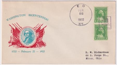 US Ed, Kentucky 1932 (Feb 22) Cacheted cover for Washington Bicentennial with 705 vertical pair. Pair is tied by a single strike of George Washington bust in square fancy cancel 276 in purple.