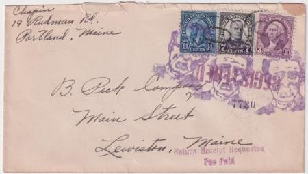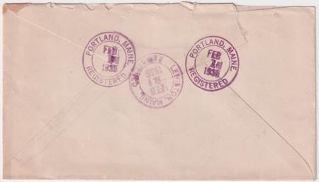 US Portland, Maine 1935 (Feb) Cover with three definitives each tied by unlisted Man’s face fancy cancel in purple. cover as top edge flaws.