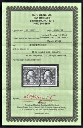 • US 355 Washington / Franklin Fine Hinged Line Pair with Weiss Cert cv $1,500