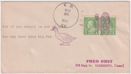 US Ed, Kentucky1935 (Nov 28) Fancy Cancel Cover with 632 pair tied by single strike of Turkey fancy cancel #274 in purple. Also stamped with Duck fancy cancel 259 in purple with typed “Now if you should be out of luck;You may have this big fat” Only comes First class.