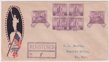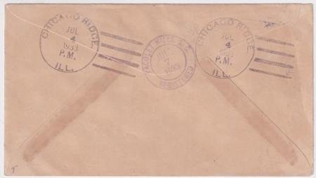 US Chicago Ridge, Illinois 1933 (Jul 4) Cacheted Independence Day registered cover with 729 singles (x2) and 729 block of 4. Both single stamps tied by Fire cracker fancy cancel N-168 in purple, block of 4 tied by Large Eagle fancy cancel 151 in purple.