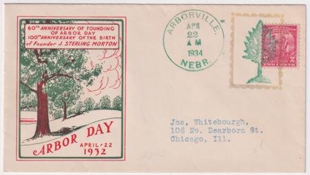 US Nebraska, Arborville 1934 (Apr 22) Arbor Day cacheted cover with 717 tied by single strike of Tree in border fancy cancel N-26. Tree is green and border is yellow.
