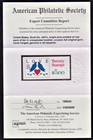 US 2441c Error Mint NH Booklet of 10 Missing Pink on Top Pane APS Cert cv $950