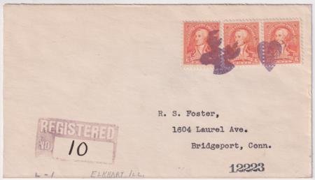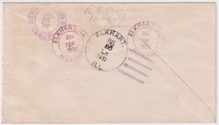 US Elkhart, Illinois 1932 (Jul 26) Registered cover to R.S. Foster with 711 x 3 tied by one strike of Elk and Heart fancy cancel 313 in purple.