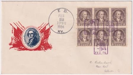 US ED, Kentucky (Feb 22) First Class cacheted cover with 704 block of six tied by three strikes of George Washington bust in square fancy cancel 276 in purple.