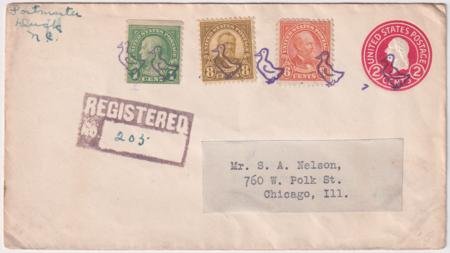 US Duck, North Carolina 1929 (Dec 18) Registered cover with 597, 638, 640 on U429, 2c postal stationery. Stamps tied by six strikes of Small Duck fancy cancel 240 in purple. Last day of issue.Cancel only used for two months.