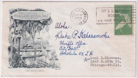 US 1948 (Oct 21) 952 Cover Signed by Duke P. Kahanamoku, Swimmer, Surfer, Olympic Gold medalist. Signed as Sheriff of Honolulu (1932-1961) Postmarked Honolulu and magazine photos clipping on reverse.