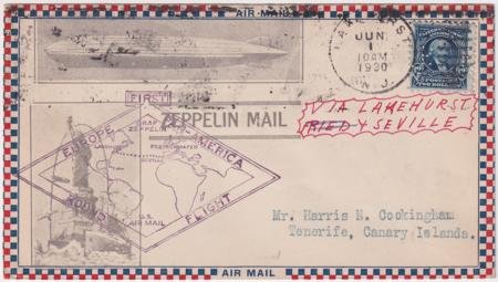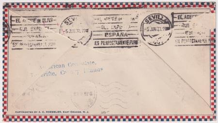 US 1930 (Jun 1) Pan America Flight on VF Roessler cacheted cover to Tenerife Canary Is. with 479, FR9 Minnesota Federal Reserve Bank Perfin. Flight to Seville is backstamped June 5. Receiving mark from American Consulate in Tenerife. Very unusual!