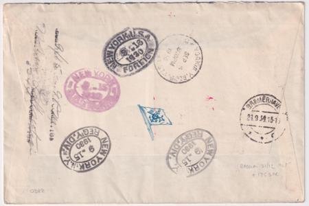 Switzerland / US 1930 (Sept 1-6) Europa Catapult Registered XF Cover. At left of cover is Bern postmark on C5, C7-9 to US. Then return flight with US C7, E14 on right side on special “Graf” cover. Interesting S/L marking on reverse., SLH K47-48 Unlisted combo but similar Sfr 800 = $800.00
