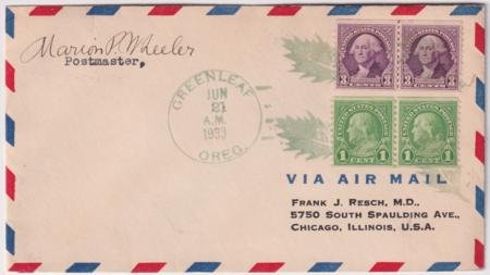 US Greenleaf, Oregon 1933 (Jun 21) Airmail cover with Scott 597 line pair and 721 line pair. Each stamp with a single strike of Leaf fancy cancel 475 in green.