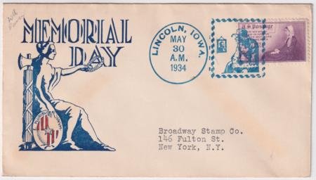 US Lincoln, Iowa 1934 (May 30) Cacheted Memorial Day cover with Scott 737 tied by single strike of Man in square fancy cancel 653 in blue. Only in use one day.
