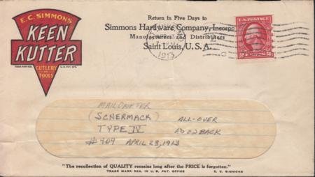US 409 FDCS Mail-O-Meter IV On Keen Kutter Tool Adv., Multicolor On Face All Over B+W On Reverse, St.Louis Apr. 23, 1913, Cover Folder Lightly Once Vert. + Horiz.