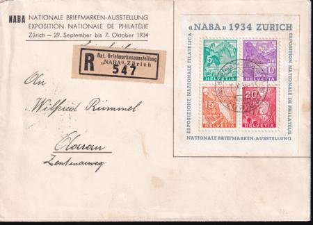 Switzerland 226 NABA S/S On VF Reg. Cover Oct. 1, 1934 To Aaraua Backstomped Oct 1.
