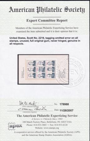 US 2219var Error Mint NH XF Tagging Omitted – APS Cert – Soon To Be Listed In Scott