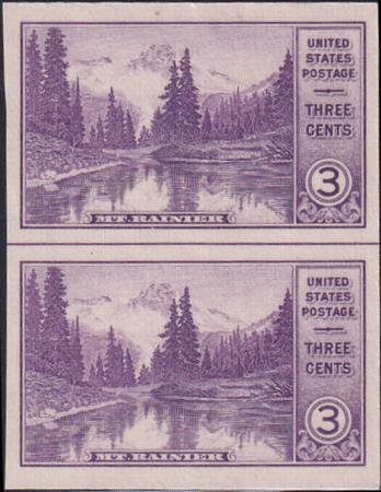 US 758 3¢ Mt. Rainier Farley Mint Positions No Gum VF Vert. Pair Horiz. Ln.