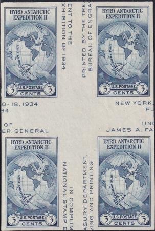 US 768a 3¢ Byrd S/S Farley Mint Positions No Gum VF Center Line Or Cross Gutter Block