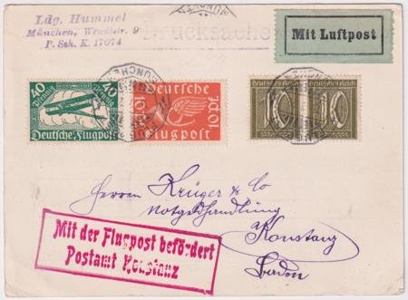 Germany 1922 (Jul 15) Pioneer flight card with C1-C2 + two definitves, Munich – Konstanz, red box cancel