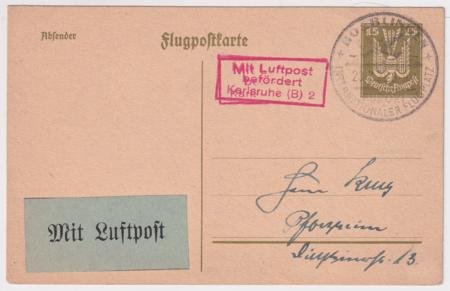 Germany 1925 (Jul 20) 15pf Printed Airmail Card sent from Boeblingen with “Mit Luftpost” Vignette and red box karsruhe flight handstamp