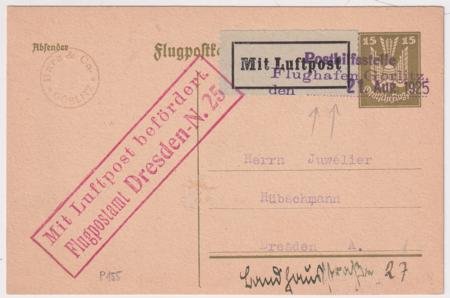 Germany 1925 (Aug 21) Goerlitz Flight Card to Dresden on 15pf Postal Card. “Posthifsstelle Flughafen Goerlitz” Cancel and red box Dresden N.25 hand stamp.