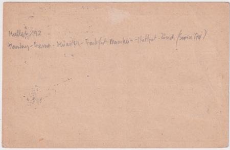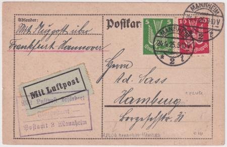 Germany 1925 (Apr 24) Mannheim to Hamburg Flight Card with violet box Mannheim flight hand stamp. Part of Mueller #192 flights