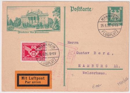 Germany 1926 (Jun 25) Mannheim – Hamburg Flight on 5pf Postal Card.Weisbaden State Theater corner card. Faint boxed Hamburg flight hand stamp.
