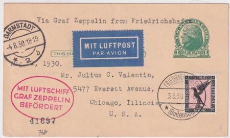 Germany 1930 (Aug 3) Zeppelin from Friedrichshafen, Landing in Darmstadt with C32 on US 1c postal card. Darmstadt receiving cancel and red oval Zeppelin handstamp