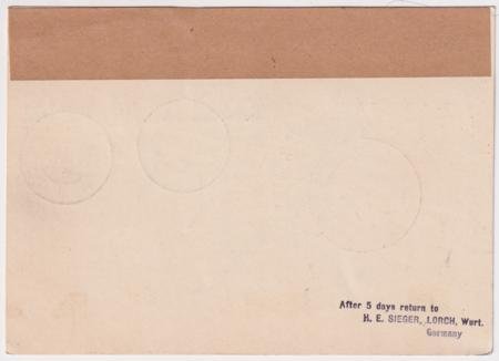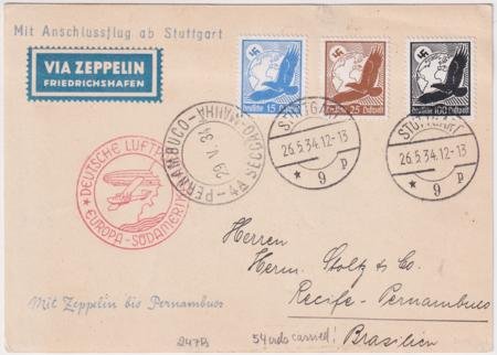 Germany 1934 (May 26) Zeppelin 1st South American Flight on Sieger Card with Stuttgart cancel. Sent to Pernambuco Brazil with redflight cachet. Believed to be only 54 cards carried. S.247Ba €75