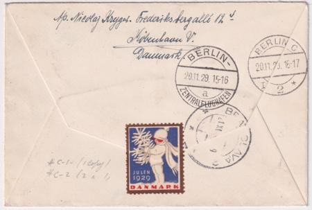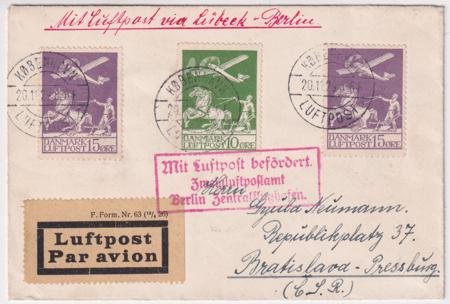 Denmark 1929 Early Airmail Cover from Copenhagen, Denmark – Bratislava (Pressburg) Czechoslovakia. Small neat cover with C1 and C2 (X2) with Berlin transit cancel and airmail label. Bratislava backstamp