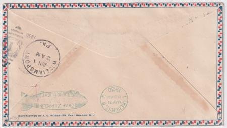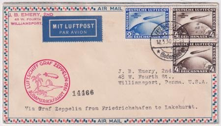 Germany 1930 (May 18) Zeppelin South American Flight Cover with C38-C39 on Roessler airmail cover. Red flight cachet and Lakehurst green receiving cancel on the reverse. Scott cv for stamps $900. S.57N