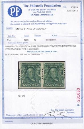 US 314 Schermack Type I Vending Machine Mint LH VF-XF 6 Holes PF Cert. Rare + Well Centered cv $1050