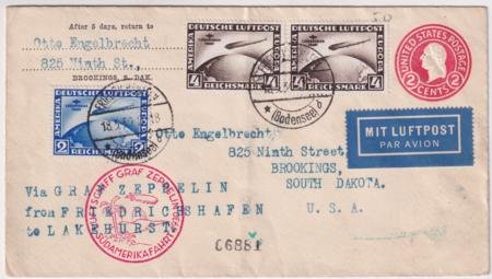 Germany 1930 (May 18) South America Pan Am flight to Lakehurst with C38 and C39 (x2) on US 2c postal stationery. Green Lakehurst receivng cancel on reverse. S.57N €675