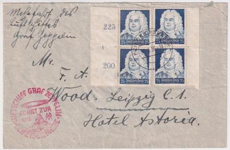 Germany 1936 (Aug 30) Graf Zeppelin Flight Cover to Leipzig. Addressed to Hotel Astoria with 4 stamp George Frideric Handel franking. S.365B