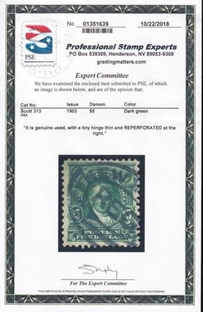 US 313 Bureau & Regular Issues Used F-VF Nicely Centered But Thin Speck – Reperfed Right – PSE Cert.