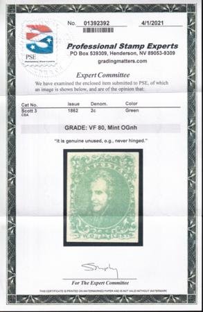 US CSA 3 Mint NH VF-XF Pristine OG NH – A True Rarity As Such. PSE VF 80 Undergraded Cert. Underpriced as NH