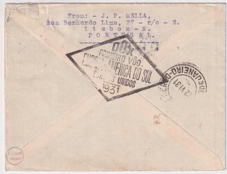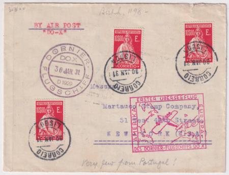 Portugal 1931 (Jan 30) Do-X Flight on Cover to U.S. Lisbon on board cancel (Type I) Jan 30 and red box D0-x cachet. Reverse with Brazil diamond cachet in black, Jun 22 Rio de Janeiro backstamp.