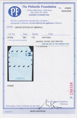 US 1961 UC35a Postal Stationary var – missing red.cv $900. PF certificate