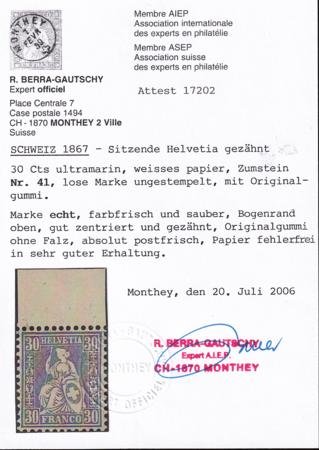 Switzerland 56(SBK 41) Mint NH XF Lovely NH Top Margin Example Must Be One Of The Finest Known! Berra Cert.