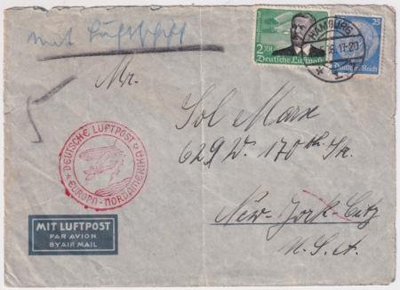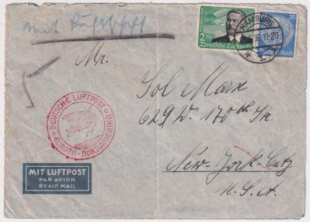 Germany 1936 (May) 2nd North American Hindenburg Flight Cover addressed to New York. Commercial use, vertical crease down center. S,410B €110