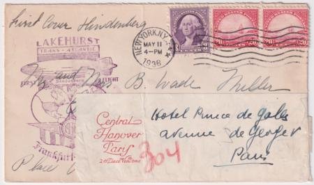 US 1936 1st North America Hindenburg Flight to Paris, Forwarded