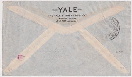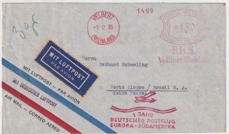 Germany 1935 (Feb 1) Commercial Catapult Flight Cover, Europa – South America. Airmail Yale & Towne Mfg. Co. cover addressed to Porto Alegre with nice Flight cachet and metered franking.