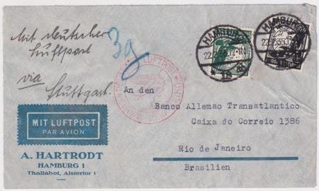 Germany 1935 (Oct 29) Commercial Catapult Flight Cover to to Rio. Airmail A. Hartrodt, transportation company, cover with two perfins