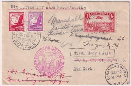 Luxembourg / Germany 1936 (Sep 22) 9th North America Flight Cover sent to NY. Luxembourg C3 pmk Spe 22 and Germany C47 and C51 pmk Sep 26. S.439B