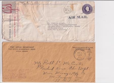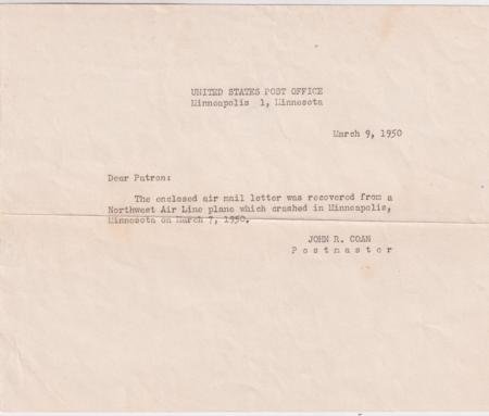 US 1950 (Mar) Washington to Minneapolis Crash Cover, missing 3x prexie. Accompanying post office letter about recovered mail.