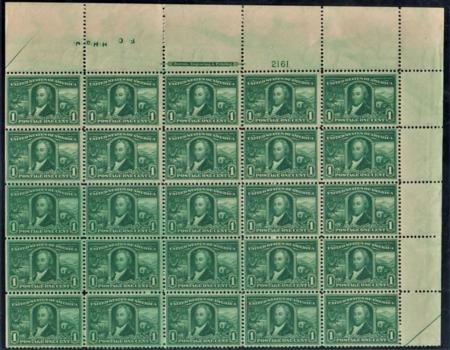 US 323 Early Commemoratives F-VF NH Top Half-Sheet 3 stamps have internal wrinkle cv $1,750